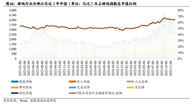 頭部公司權(quán)重提升顯著,關(guān)注頭部公司的估值水平。從市值體量來(lái)看,游戲行業(yè)頭部公司世紀(jì)華通、巨人網(wǎng)絡(luò)、愷英網(wǎng)絡(luò)、三七互娛、吉比特、完美世界、神州泰岳 7 家公司合計(jì)市值占整體游戲行業(yè)總市值比例在今年顯著提升,從過(guò)去的 50%上下提升到最高達(dá) 67%,近期有所回落仍保持 65%上下,頭部公司對(duì)行業(yè)影響權(quán)重突出。
