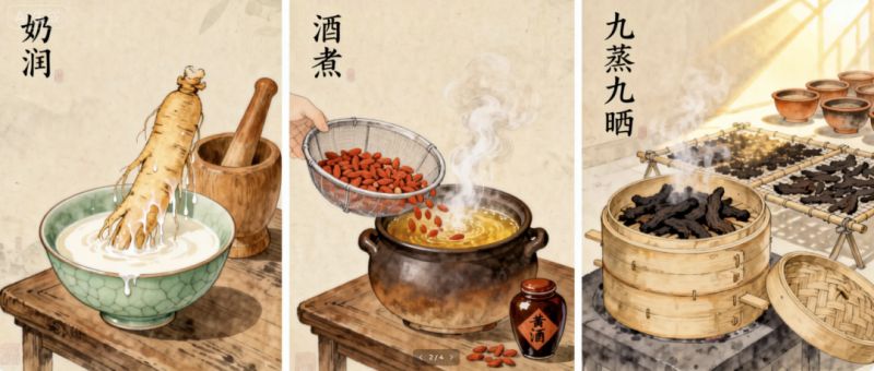 清宮壽桃丸制作技藝之精妙,尤以“奶潤酒煮”與“九蒸九曬”這兩大絕技為甚,堪稱點(diǎn)睛之筆。其中“奶潤”是指人參的炮制工藝,現(xiàn)采用牛乳替代,功效不變,人參經(jīng)奶潤后可降低其燥性,使藥性更加溫和?!熬浦蟆笔侵歌坭阶拥呐谥萍妓?,需以精選的糯米、酒曲等原料釀造而成的醇厚芳香黃酒為引,酒煮前更需細(xì)細(xì)篩揀,去凈雜質(zhì),剔除脫落的果梗,確保藥材的純凈與道地。此后,以酒煮之,取其精華熬制為膏。地黃的炮制則更是耗時(shí)費(fèi)力,彰顯匠心獨(dú)運(yùn)。清宮壽桃丸所選用的地黃個(gè)體肥大,質(zhì)地緊密,難以蒸透,因此采用“九蒸九曬”的古老技藝。經(jīng)黃酒浸潤后,歷經(jīng)九次蒸煮、九次暴曬,整個(gè)蒸曬過程橫跨三九之期,歷時(shí)之久,工序之繁,可見一斑,充分體現(xiàn)了清宮壽桃丸制作工藝的精髓,也凝聚了千百年來傳統(tǒng)中醫(yī)藥的智慧結(jié)晶。