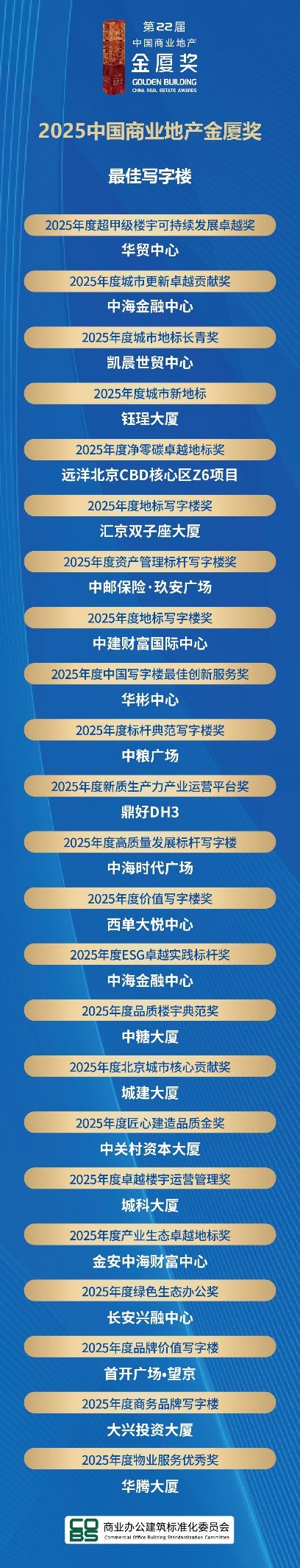 2025年12月底,中國(guó)寫字樓產(chǎn)業(yè)園發(fā)展論壇第22屆年會(huì)在北京富力萬(wàn)麗酒店盛大召開。年會(huì)上,房訊指數(shù)CORC、商業(yè)辦公建筑標(biāo)準(zhǔn)化委員會(huì)聯(lián)合發(fā)布了《2025中國(guó)寫字樓產(chǎn)業(yè)園競(jìng)爭(zhēng)力研究報(bào)告》,備受矚目的“2025中國(guó)寫字樓產(chǎn)業(yè)園行業(yè)競(jìng)爭(zhēng)力100強(qiáng)”榜單正式揭曉,第22屆“中國(guó)商業(yè)地產(chǎn)金廈獎(jiǎng)GOLDEN BUILDING AWARDS”頒獎(jiǎng)盛典同步舉行。