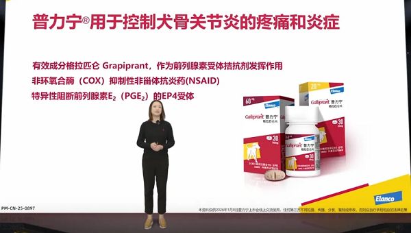 禮藍(lán)寵物健康事業(yè)部產(chǎn)品部門負(fù)責(zé)人應(yīng)悅佳,深度介紹了新品普力寧?(Galliprant?,格拉匹侖片)的相關(guān)信息。普力寧?的主要成分是格拉匹侖,是一種非環(huán)氧合酶(COX)抑制性非甾體類抗炎藥(NSAID),是前列腺素E2(PGE2)EP4受體拮抗劑。EP4受體是負(fù)責(zé)調(diào)節(jié)PGE2引發(fā)炎癥及疼痛的關(guān)鍵受體,是引起傷害感受的主要介質(zhì)。格拉匹侖通過與PGE2的EP4受體結(jié)合,從而達(dá)到抗炎和鎮(zhèn)痛的效果1。國(guó)外真實(shí)證據(jù)展示其良好的療效與安全性,自2016年Galliprant?在境外上市以來,10年累計(jì)惠及了全球千萬只患犬2。普力寧?在中國(guó)上市,是犬骨關(guān)節(jié)炎長(zhǎng)期管理邁出的關(guān)鍵一步。