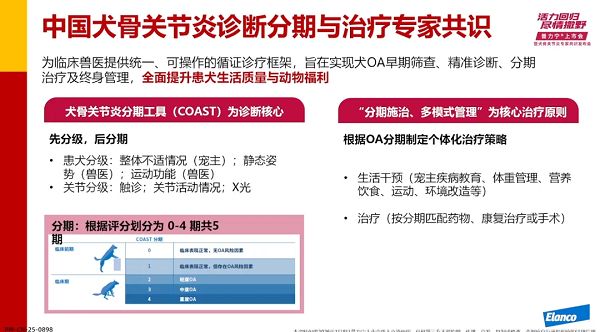 接下來,中國(guó)農(nóng)業(yè)大學(xué)動(dòng)物醫(yī)院手術(shù)中心主任石磊,帶來犬骨關(guān)節(jié)炎專家共識(shí)介紹和診療經(jīng)驗(yàn)分享,指出共識(shí)為臨床獸醫(yī)提供統(tǒng)一、可操作的循證診療框架,旨在實(shí)現(xiàn)犬骨關(guān)節(jié)炎早期篩查、精準(zhǔn)診斷、分期治療及終身管理,全面提升患犬生活質(zhì)量與動(dòng)物福利。診斷以COAST為準(zhǔn)則,遵循“先分級(jí)、后分期”。治療上確立“分期施治、多模式管理”原則。COAST將犬骨關(guān)節(jié)炎劃分為5個(gè)連續(xù)且明確的臨床階段,覆蓋從風(fēng)險(xiǎn)期到終末期的全疾病譜。早期篩查治療有效減輕癥狀,助力患犬維持日?;顒?dòng)。