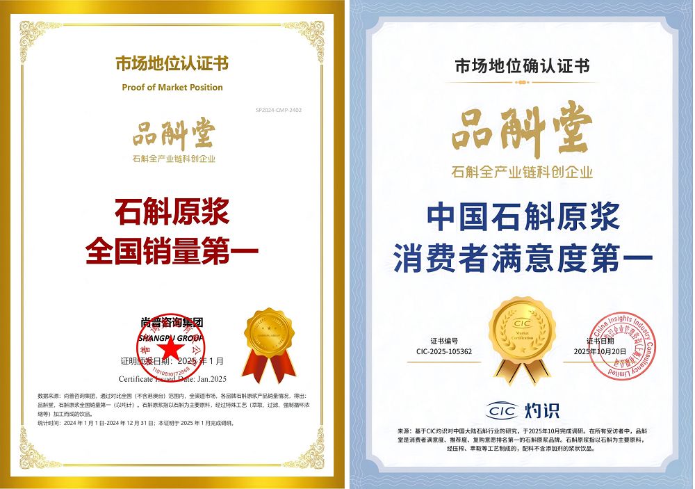 依托得天獨厚的產(chǎn)區(qū)優(yōu)勢,品斛堂構(gòu)建 “種植 - 研發(fā) - 制造 - 營銷” 全產(chǎn)業(yè)鏈布局,獲評農(nóng)業(yè)產(chǎn)業(yè)化國家重點龍頭企業(yè)、國家林業(yè)重點龍頭企業(yè),多項市場地位獲第三方專業(yè)咨詢機構(gòu)確認(rèn) —— 尚普集團確認(rèn)其 “石斛原漿全國銷量第一”【1】;CIC 灼識確認(rèn)其 “中國石斛原漿消費者滿意度第一”【2】等。