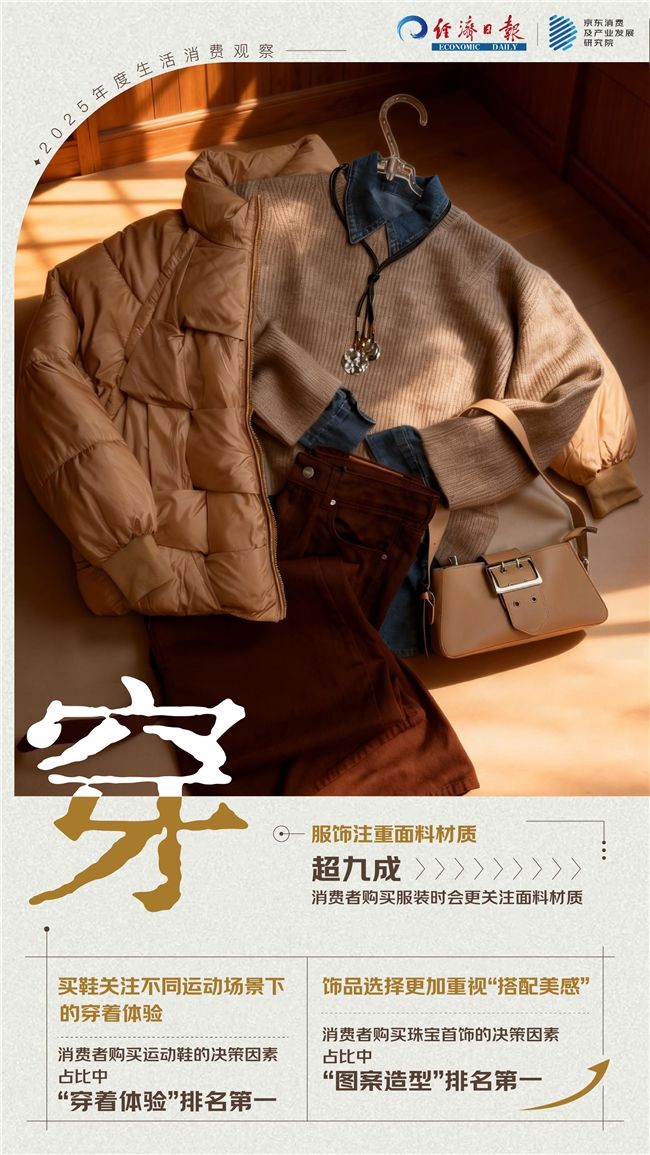 服飾選擇更加關(guān)注材質(zhì)了:選面料、看參數(shù),做“理性穿搭家”。2025年,消費(fèi)者在購(gòu)買(mǎi)服飾時(shí)更加務(wù)實(shí)、講究。京東調(diào)研顯示,超過(guò)九成的消費(fèi)者表示,購(gòu)買(mǎi)服裝時(shí)會(huì)更關(guān)注面料材質(zhì),其中48.6%的消費(fèi)者將面料視為服裝品質(zhì)的三大要素之一。可見(jiàn),面料成為消費(fèi)者進(jìn)行服飾消費(fèi)時(shí)的首要關(guān)注點(diǎn)。尤其在羽絨服、羊毛衫等單價(jià)較高、功能性較強(qiáng)的品類(lèi)上,超七成消費(fèi)者會(huì)仔細(xì)研究“充絨量”、“絨子含量”、“防風(fēng)指數(shù)”等關(guān)鍵參數(shù)。大家仿佛都化身為“產(chǎn)品經(jīng)理”,通過(guò)選面料、看參數(shù)來(lái)降低“買(mǎi)錯(cuò)成本”,提升穿著體驗(yàn)。從“看款式”到“看參數(shù)”,背后是消費(fèi)者認(rèn)知的升級(jí),衣服不僅要好看,更追求質(zhì)感。