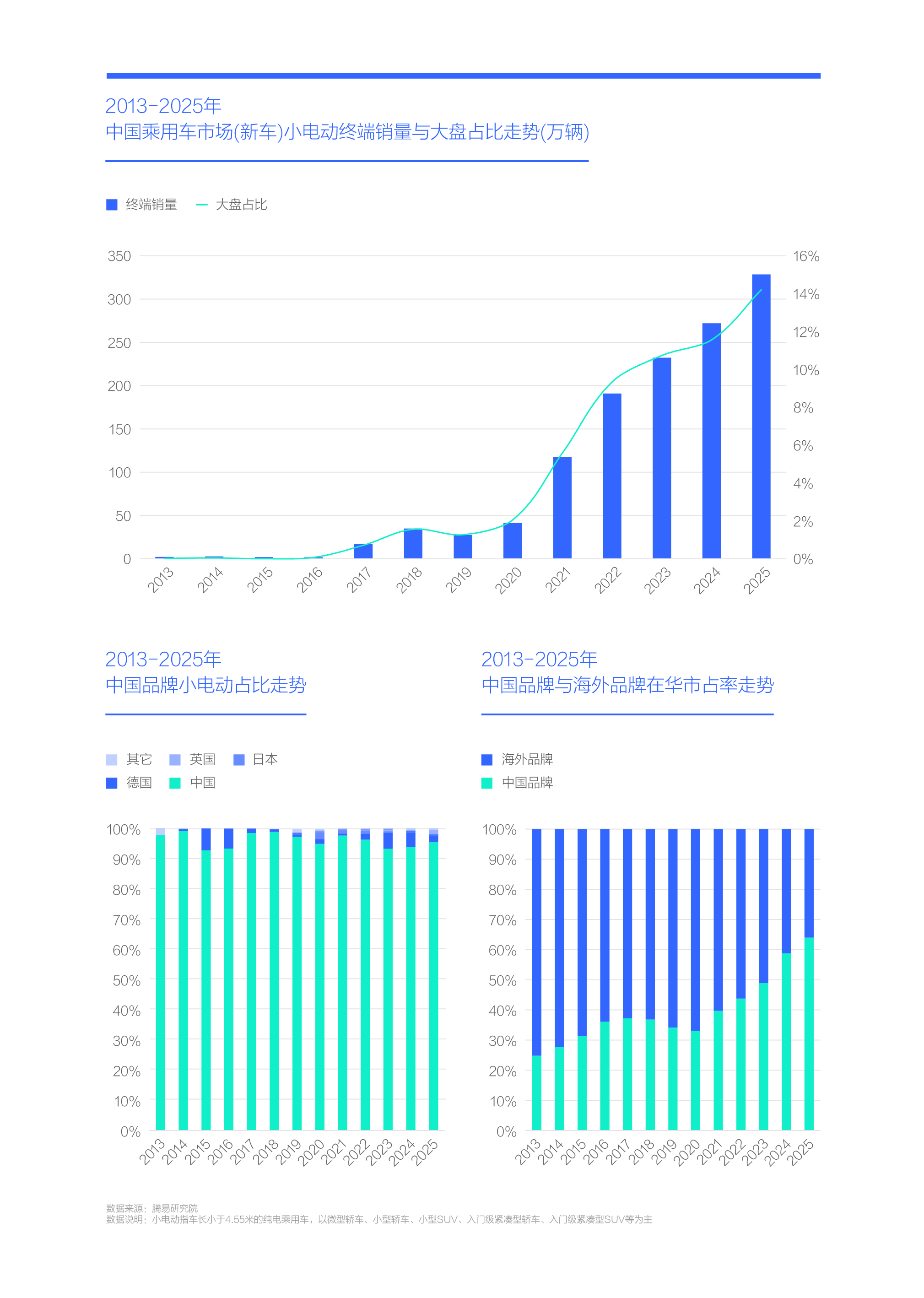 2020-2025年,中國(guó)車市的小電動(dòng)銷量從不足50萬輛飆升至300多萬輛,中國(guó)品牌占比近96%,幾乎是唯一受益者