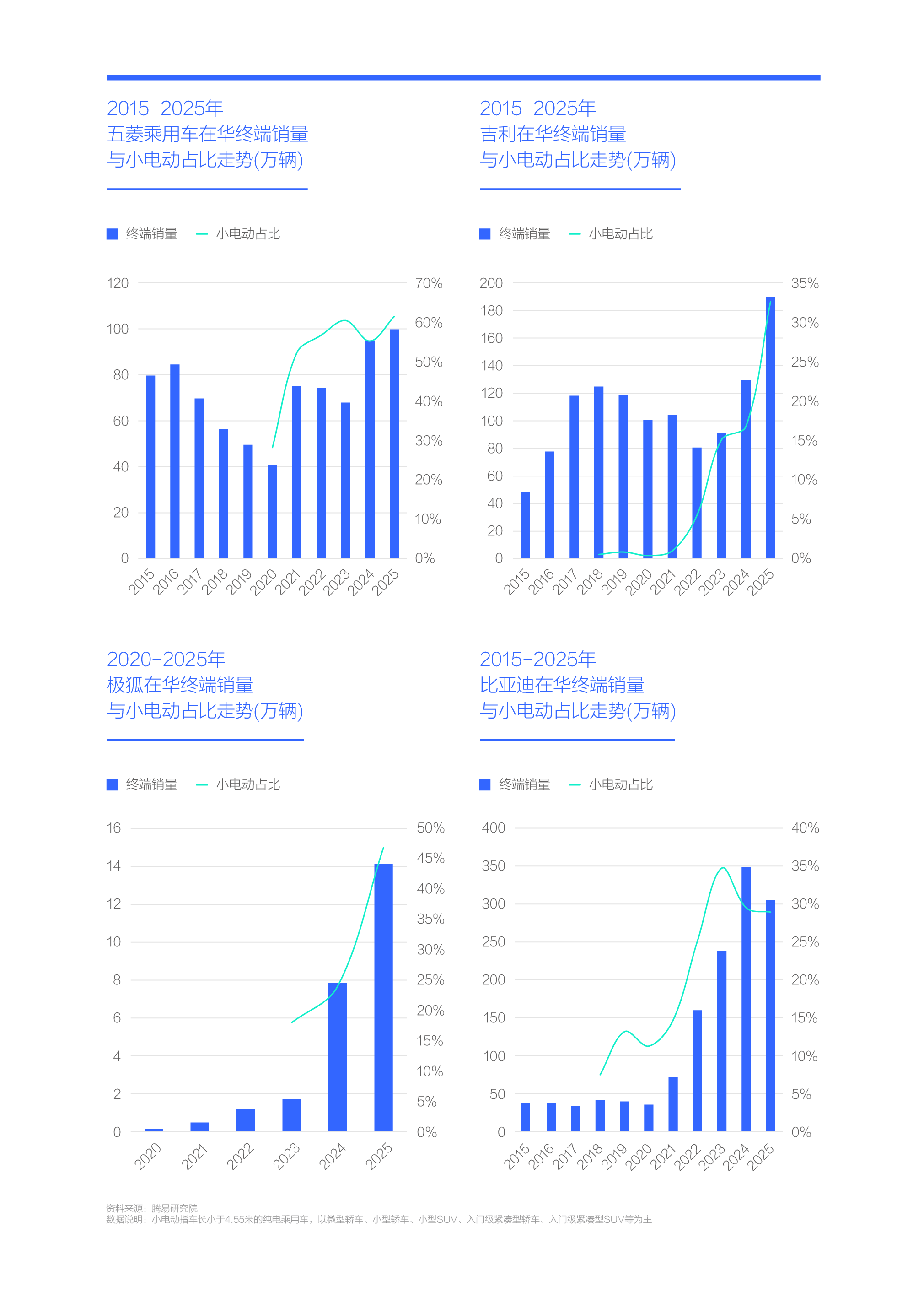 2020-2025年,在中國(guó)品牌在華終端銷量由不足700萬輛飆升至1500萬輛,和市占率由30%多飆升至60%多的過程中,小電動(dòng)不僅貢獻(xiàn)了三分之一的銷量,也間接助推了另外三分之二的增量。在前三年有疫情后三年有經(jīng)濟(jì)萎靡的至暗時(shí)刻,小電動(dòng)助推中國(guó)品牌強(qiáng)勢(shì)崛起并成為中國(guó)車市的新主導(dǎo)力量;