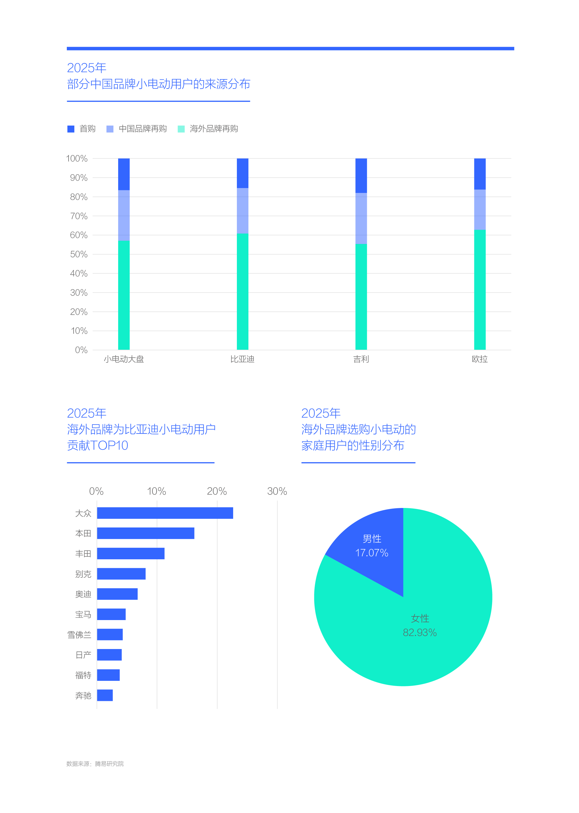 如果小電動(dòng)的價(jià)值,僅僅是薄利多銷,一些盈利狀況比較好的主流車企,完全沒必要布局小電動(dòng),但實(shí)際情況未必如此。2025年近六成小電動(dòng)用戶來自海外品牌的家庭用戶,其中比亞迪和歐拉的比例超過六成,吉利55%;