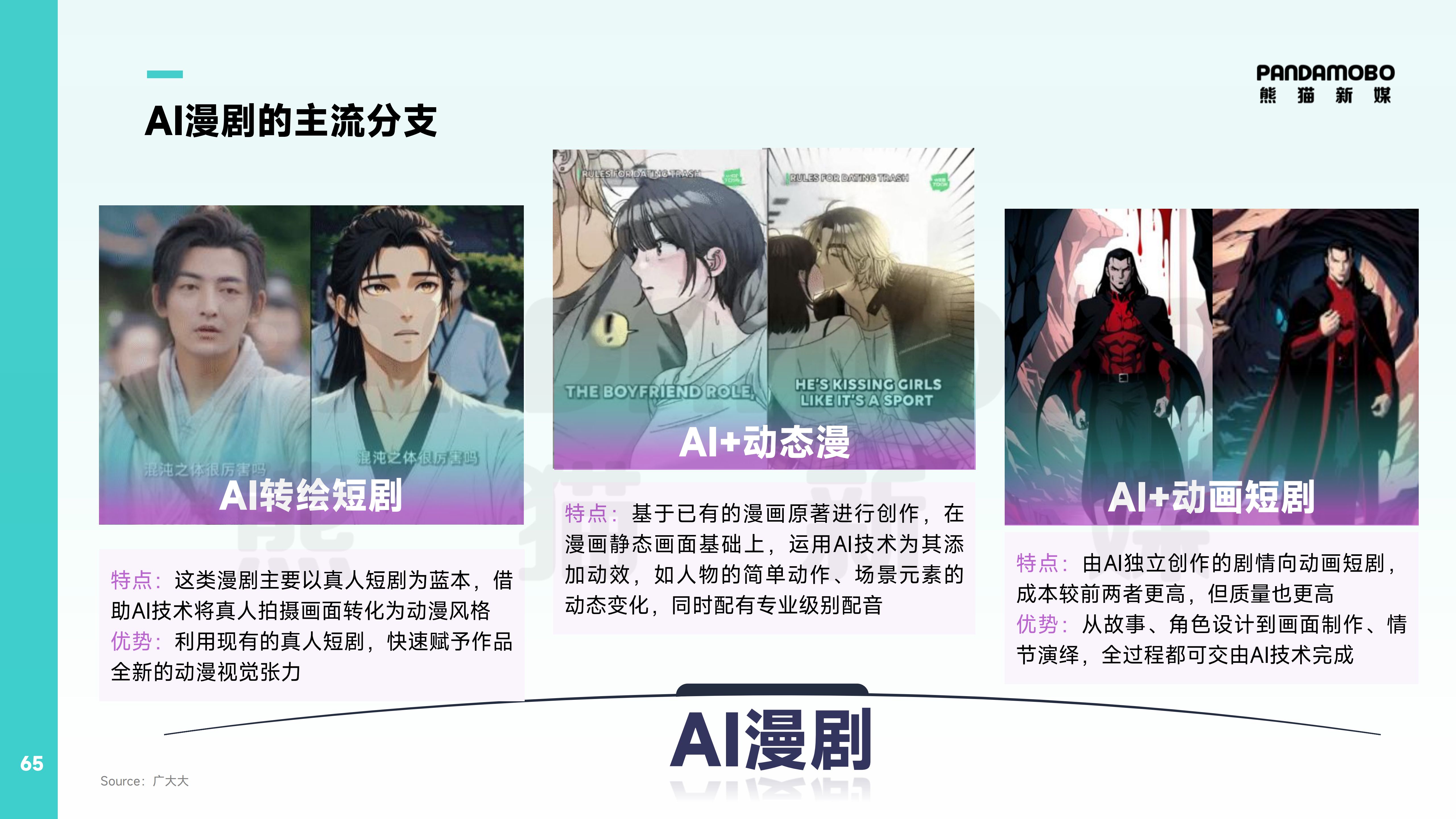 但AI不止于工具性賦能,它深度影響了短劇創(chuàng)作,更是催生出“零真人成本”的內(nèi)容新物種AI漫劇。PandaMobo系統(tǒng)梳理了AI漫劇三大形態(tài):AI轉(zhuǎn)繪短劇將真人畫面轉(zhuǎn)化為動漫風格,實現(xiàn)IP視覺煥新;AI+動態(tài)漫基于漫畫原著添加動效與配音,激活存量IP價值;AI+動畫短劇由AI全流程創(chuàng)作,雖成本更高但質(zhì)量突破上限。