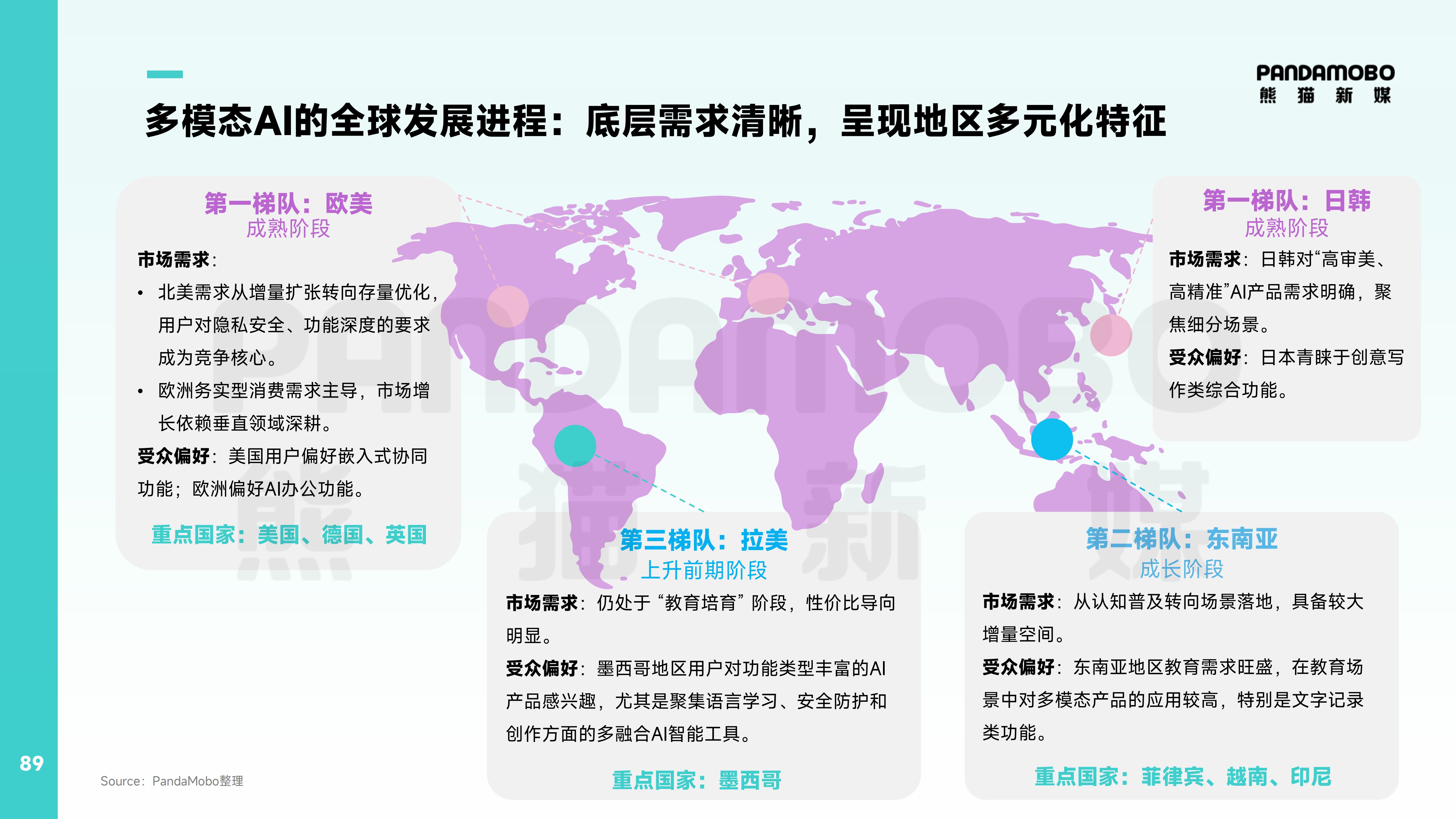 目前區(qū)域市場呈現(xiàn)“三梯隊”格局:北美、歐洲作為成熟市場,用戶對隱私安全和功能深度要求苛刻;同為成熟市場的日韓則青睞高審美、高精準產(chǎn)品;東南亞處于成長階段,菲律賓、越南、印尼的教育場景需求旺盛——每個區(qū)域市場都有偏好市場亟待填補。但同時,合規(guī)、隱私安全與文化紅線必須嚴守,涉及地緣政治、宗教沖突、社會敏感話題的素材必須一票否決,“智能向善”的理念將助力企業(yè)突破地緣壁壘。