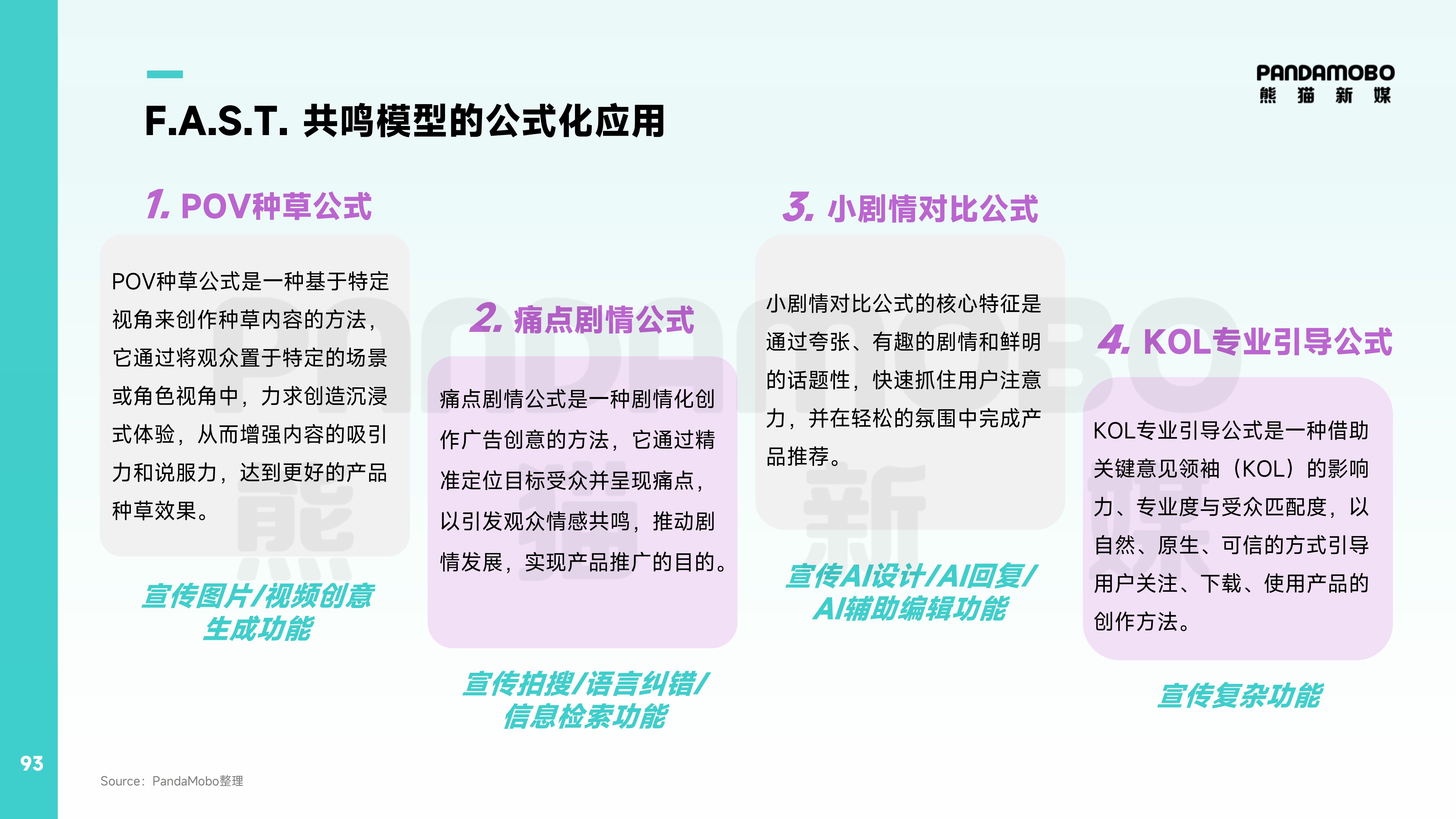 在這種背景下,行業(yè)已從“功能競賽”轉(zhuǎn)向“精準穿透”,誰能用更少預算擊穿更深用戶心智,誰就能存活。針對多模態(tài)AI產(chǎn)品的營銷痛點,PandaMobo提出F.A.S.T.共鳴模型,通過: