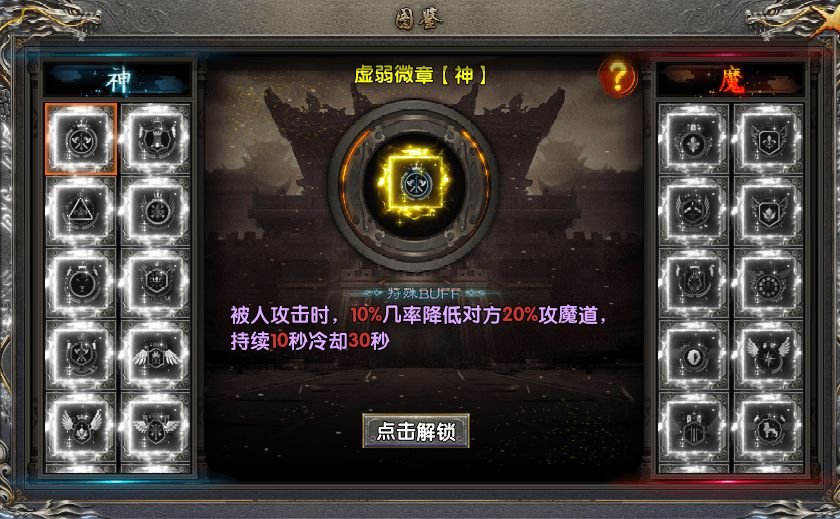 游戲中還有神魔徽章系統(tǒng),同樣可以提升雙防、攻魔道、生命值的基礎(chǔ)屬性加成,還有88%的全屬性加成,另外還有特殊的buff效果:神徽章主打防御,魔徽章主打削弱對手,也有部分防御buff,兩個徽章一起戴上,等于是雙倍提升了自己的實力。和命格一樣,徽章也可以在圖鑒系統(tǒng)里進行收集和替換,收集徽章還能額外再得到屬性加成獎勵。