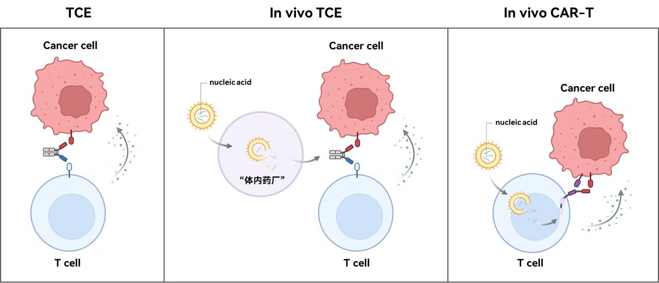 · In vivo TCE(體內(nèi)生成TCE):相當(dāng)于“體內(nèi)藥廠”,通過 LNP、AAV 等載體把編碼 TCE 的核酸送進(jìn)體內(nèi)細(xì)胞,在細(xì)胞內(nèi)直接編碼并生成功能性的 TCE, 無需復(fù)雜的體外生產(chǎn)和純化流程,還能通過載體設(shè)計精準(zhǔn)遞送,減少系統(tǒng)性毒性和優(yōu)化給藥次數(shù)。