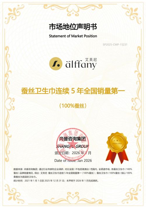 2026年1月,尚普咨詢集團向艾芙尼頒發(fā)市場地位聲明書。艾芙尼榮獲【蠶絲衛(wèi)生巾連續(xù)5年全國銷量第一(100%蠶絲)】市場地位聲明,標志著其在女性護理行業(yè)的卓越地位及消費者的高度認可與信賴。