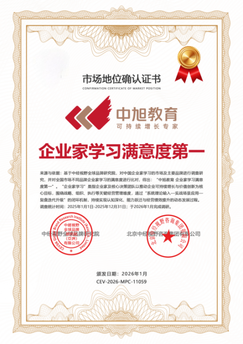 “企業(yè)家學(xué)習(xí)滿意度第一”,這份沉甸甸的認(rèn)證,是對過往的肯定,更是對未來的鞭策。它印證了中旭教育所走的路徑——一切以客戶的增長結(jié)果為中心,一切以助力企業(yè)實(shí)現(xiàn)“正規(guī)化、持續(xù)化”為歸宿。