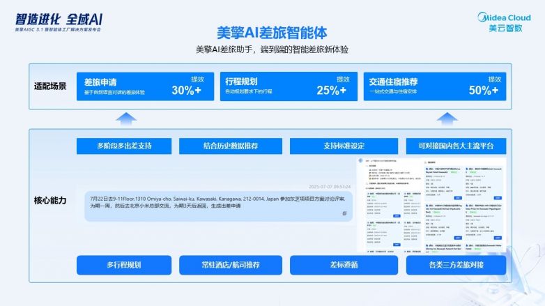 美擎AI差旅智能體:輸入“客戶拜訪”“展會(huì)參展”等需求,自動(dòng)生成差旅方案并自動(dòng)匹配預(yù)算,審批流程大大縮短;