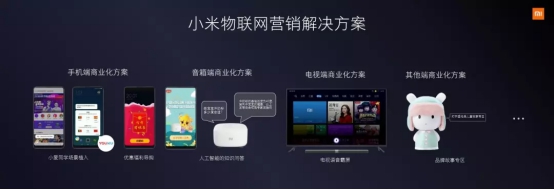 此次推介會(huì),小米營(yíng)銷(xiāo)首次提出圍繞IoT的四大商業(yè)化營(yíng)銷(xiāo)解決方案——手機(jī)端商業(yè)化方案、音箱端商業(yè)化方案、電視端商業(yè)化方案和其他端商業(yè)化。