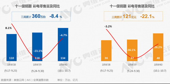 權(quán)威市場(chǎng)調(diào)研機(jī)構(gòu)奧維云網(wǎng)(AVC)發(fā)布的《2018年中國(guó)彩電市場(chǎng)“十一”促銷總結(jié)報(bào)告》顯示,受存量市場(chǎng)需求不振的影響,十一促銷期經(jīng)歷了多年的持續(xù)下滑,今年再次創(chuàng)造了歷史新低。數(shù)據(jù)顯示, 今年十一促銷期累計(jì)彩電零售量為360萬臺(tái),同比下降8.4%,零售額121億元,同比下降22.1%,彩電行業(yè)又開始“入冬”了。