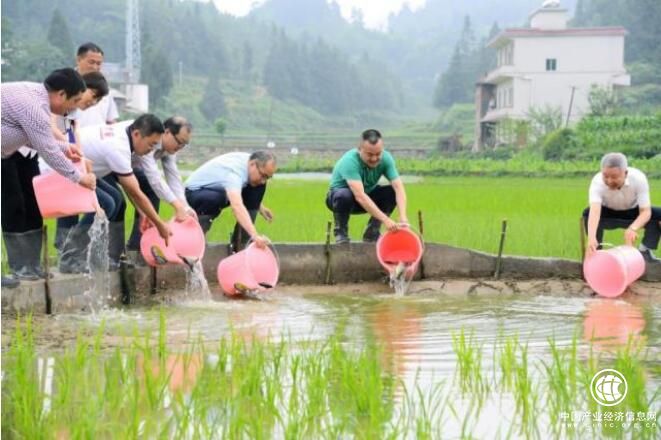 ↑瀘州老窖股份有限公司黨委書(shū)記、董事長(zhǎng)劉淼(右二)帶領(lǐng)企業(yè)員工幫扶向田村發(fā)展稻田養(yǎng)魚(yú)項(xiàng)目 瀘州老窖/供圖